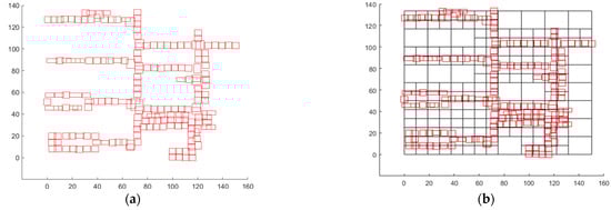 Based on the RSSI signal data, the proposed technique is applied to represent the BB, and the final BB is obtained through the process of merging and expanding the BB. The result is then divided into cells, as shown in (a) of Figure 3. The initial cell is sized to encompass all BBs placed within the floor, and the distribution of BBs across the cells demonstrates that the BBs and cells form the foundation for generating movement paths. This is (b) in Figure 3. As a result, we can observe that the BBs positioned within the entire cell represent the gathered dataset as BBs, and they are organized and divided in a manner consistent with the actual indoor structure of the floor.
