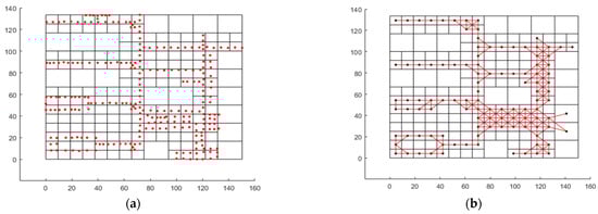 Cell division and movement path computation: (a) Distribution the initial data with the cell structure divided by the cell algorithm. (b) Paths generated by the movement path generation algorithm.
