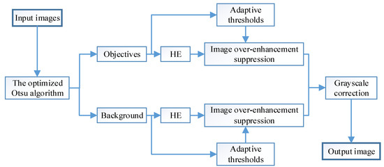 In this study, we propose the AICHE algorithm to segment the image into two sub-histograms of target and background by improving upon the Otsu method, and then perform the histogram equalization process separately, which ensures that the average brightness of the original image will not be shifted. Additionally, the algorithm segments the histogram of the image based on the adaptive threshold. This effectively avoids the phenomenon of image over-enhancement and also prevents detail loss to a certain extent. The flowchart of the AICHE algorithm is shown in Figure 1.