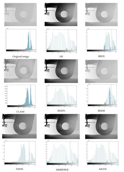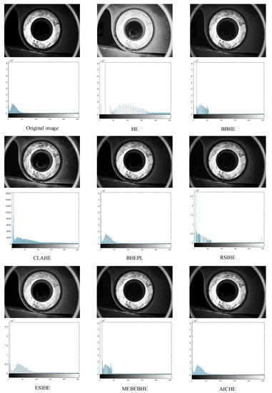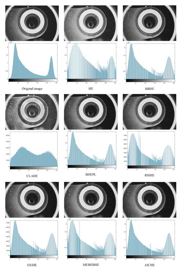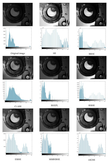 From Table 1 and Table 2, the AICHE algorithm has the highest PSNR value and the SSIM value is closest to 1.The image information entropy in Table 3 demonstrates the richness of details in the image. The information entropy of the image processed by CLAHE obviously exceeds that of the original image, which indicates that noise is introduced in the image and produces a block effect. Except for the CLAHE algorithm, the AICHE algorithm has the highest information entropy value, indicating that the gray level merging phenomenon is effectively avoided in the equalization process, which can protect the image information. ESIHE cannot maintain the average image brightness well, which is also clearly reflected by the AMBE values in Table 4.