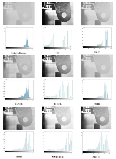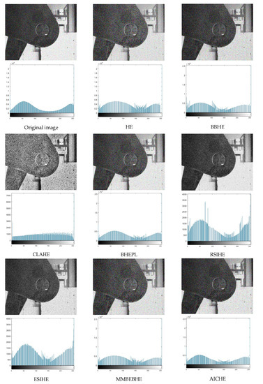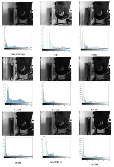 As can be seen in Figure 4, Figure 5, Figure 6, Figure 7, Figure 8, Figure 9, Figure 10, Figure 11, Figure 12 and Figure 13, the HE algorithm shows an obvious phenomenon of image brightness change and detail loss. Under low light conditions, the BBHE, RSIHE, and MMBEBHE algorithms can protect the average brightness but will lead to uneven histogram balance due to unreasonable histogram segmentation, which is less effective for detail processing and will cause local area distortion. CLAHE can protect the image details but will introduce a large amount of noise, especially in Figure 10 and Figure 13 where the image visual effect is significantly reduced. The AICHE algorithm improves the image contrast under the condition of protecting the average brightness of the image; it does not introduce excessive noise, and, to a certain extent, it retains the original shape of the original histogram.