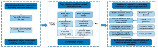 The cloud model is utilized for the appropriateness evaluation of urban engineering construction, which establishes a grade standard for suitability evaluation using the cloud model. The digital features of the second-level index cloud are generated through utilizing the reverse cloud generator, and then obtaining the digital feat. Firstly, the suitability evaluation system for engineering construction is established through identifying single influencing factors. Then, the index weight is determined through a combination of the analytic hierarchy process and entropy weight method. Subsequently, the complete cloud map is generated using a forward cloud generator and compared with a standard cloud map to obtain the results of the suitability evaluation. The overall method flow is shown in Figure 1.