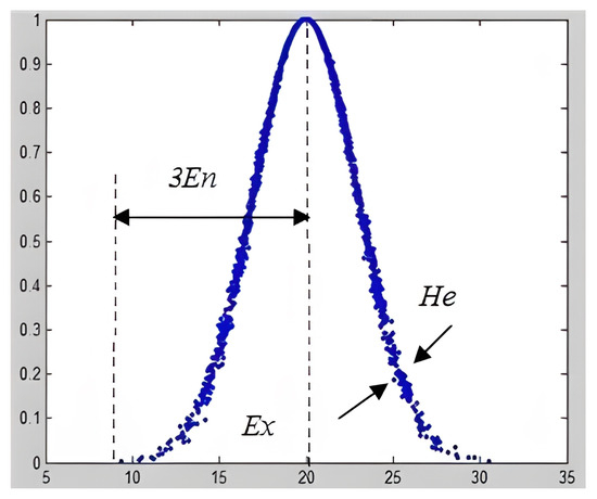 Expectation, entropy, and hyper-entropy He (Figure 2) are used to explain the numerical features of the cloud. The point that best embodies a qualitative concept is expectation, which also serves as the universe’s focal point. Entropy is used to reflect the likelihood and ambiguity of qualitative concepts; the higher the entropy, the wider the range of qualitative concepts that can be accepted. Hyper-entropy He is the entropy of entropy, which symbolizes the thickness of the cloud. The degree of membership dispersion increases as the cloud drop thickness increases. The value is often based on empirical data; there is no precise guideline for choosing hyper-entropy.