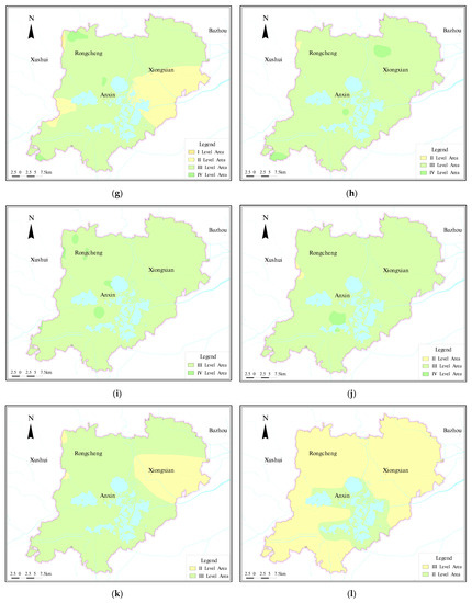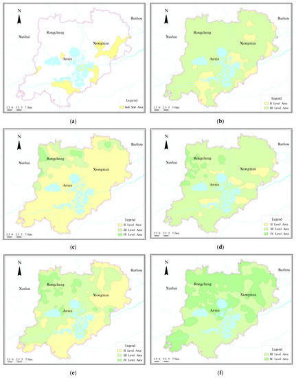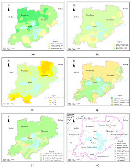 Evaluation results of single-factor analysis. (a) Soft soil distribution map in Xiongan New Area; (b) zoning map of 0–5 m foundation bearing capacity in Xiongan New Area; (c) zoning map of 5–10 m foundation bearing capacity in Xiongan New Area; (d) zoning map of 10–15 m foundation bearing capacity in Xiongan New Area; (e) zoning map of 15–30 m foundation bearing capacity in Xiongan New Area; (f) zoning map of 30–50 m foundation bearing capacity in Xiongan New Area; (g) 0–5 m compressibility zoning diagram of soil in Xiongan New Area; (h) 5–10 m compressibility zoning diagram of soil in Xiongan New Area; (i) 10–15 m compressibility zoning diagram of soil in Xiongan New Area; (j) 15–30 m compressibility zoning diagram of soil in Xiongan New Area; (k) 30–50 m compressibility zoning diagram of soil in Xiongan New Area; (l) classification chart of shallow groundwater depth in Xiongan New Area; (m) zoning map of soil corrosion in Xiongan New Area; (n) zoning map of groundwater corrosion in Xiongan New Area; (o) gradation map of land subsidence rate in Xiongan New Area (2016); (p) zoning map of flood inundation potential in Xiongan New Area; (q) classification chart of the sand liquefaction in Xiongan New Area; (r) hidden fault structure distribution map in Xiongan New Area.