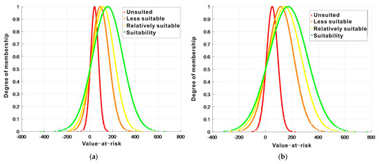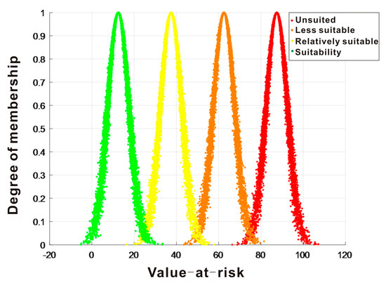We initially develop a common assessment cloud before performing engineering, geological environment, and construction suitability evaluation. In accordance with the Xiongan New Area’s established engineering, geological, and construction suitability evaluation system (Table 2), the new area’s suitability evaluation grades are separated into four categories: suitable, more suitable, generally appropriate, and poorly suitable. The equivalent value range is set to [0, 100], with [0, 25) denoting the area that is most suitable, [25, 50) the area that is more suitable, [50, 75) the area that is generally suitable, and [75, 100] the area that is least suitable. Higher scores indicate a worse fit, whereas lower scores indicate greater suitability. The standard evaluation cloud model is then produced using the cloud model’s inverse cloud generator (Figure 6). To ascertain the level of construction suitability for the project, the final results of the construction suitability evaluation are compared and examined. Table 4 displays the numerical properties of the derived standard cloud model.