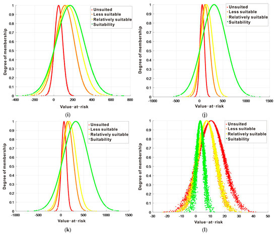 Cloud model of second-level index of suitability evaluation of engineering construction. (a) Cloud model of 0–5 m foundation bearing capacity; (b) cloud model of 5–10 m foundation bearing capacity; (c) cloud model of 10–15 m foundation bearing capacity; (d) cloud model of 15–30 m foundation bearing capacity; (e) cloud model of 30–50 m foundation bearing capacity; (f) cloud model of soil comprehensibility; (g) cloud model of shallow groundwater depth; (h) cloud model of corrosion of soil and water; (i) cloud model of land subsidence; (j) cloud model of sand liquefaction; (k) cloud model of flood inundation potential; (l) cloud model of seismic fortification intensity.