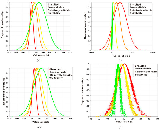 Cloud model of first level index of suitability evaluation of engineering construction. (a) Foundation soil condition; (b) hydrogeology condition; (c) environmental geological problem; (d) field stabilization.