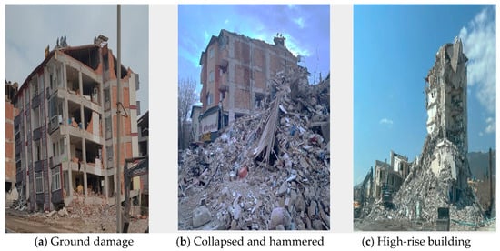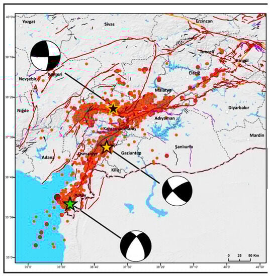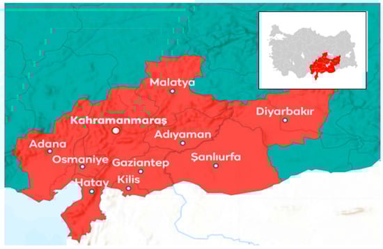 On 6 February 2023, two major earthquakes occurred in Kahramanmaraş. The first earthquake, centered in Pazarcık, Kahramanmaraş, had a magnitude of Mw 7.7, and it was recorded at 04:17 (01:17 UTC) local time. The second earthquake, with a magnitude of Mw 7.5, occurred in Elbistan, Kahramanmaraş, on the same day at 13:24 (11:24 UTC) local time. In addition, an aftershock close to the first earthquake with a magnitude of Mw 6.7 occurred in Nurdağı, Gaziantep, at 04:28 (01:28 UTC). Aftershocks continued in the affected region for an extended period. The focal depths of the first and second earthquakes were 8.6 km and 7 km, respectively. Aftershocks with a magnitude as high as 6.5 occurred in both affected districts within 24 h of the initial earthquakes. Another earthquake, measuring Mw 6.4, took place in Yayladağı, Hatay, on 20 February 2023 at 20:04 local time. These earthquakes, unprecedented in recent history with respect to their size and impact, caused extensive destruction in 11 Turkish provinces (Figure 2) [29,32].