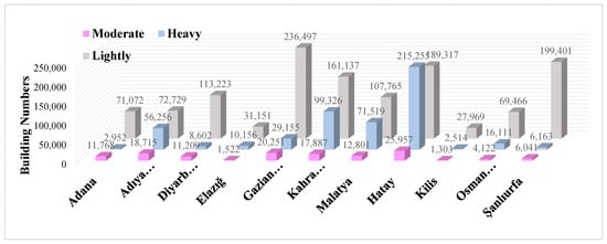 Almost 280,000 buildings were destroyed or severely damaged, and the 11 affected provinces experienced substantial financial losses [33]. The general population in these regions generally lived in highly sensitive structures that were seismically sensitive, but there were also some resilient structures. With each earthquake and the resulting aftershocks, the structures in these regions continued to be damaged. The damaged buildings were mainly masonry and poor-quality concrete structures without ductility. According to the 2021 Building and Housing Characteristics Survey, the percentage of households living in buildings constructed in 1980 and earlier was 10% in the affected regions, while it was 12.6% in Turkey as a whole. However, in Adana, Hatay, and Kilis, this percentage was higher than the national average. In contrast, the proportion of households living in buildings built between 1981 and 2000 was 30.9% in Turkey as a whole and 27.6% in the 11 provinces. In Adana and Hatay, the rate of households living in buildings constructed during this period was higher than that for the overall population of Turkey. In contrast, the rate of households living in buildings constructed since 2001 was 47.4% in Turkey as a whole, while in the earthquake zone, this was 51.1%. In Adana, Hatay, and Kilis, however, this percentage was lower than the national average. This indicates that the buildings in Adana, Hatay, and Kilis were relatively old [33].