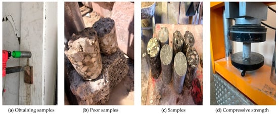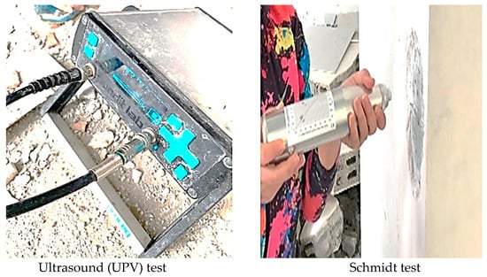 In this study, only core samples were taken from the structures, and in situ non-destructive experiments were conducted. The UPV and Schmidt tests were carried out both in situ and in the laboratory environment on samples taken from the buildings (Figure 9).