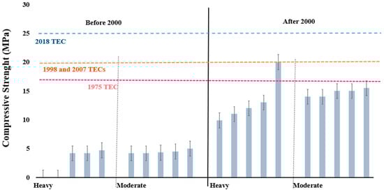 In building design in Turkey, the acceptable concrete strength specified by TS 500, /1969, B160, and TS 500/1984 [39] is 14 MPa (provided by Turkish Standards). A correction factor of 0.85 for calculating the equivalent characteristic compressive strength is given by TS EN 13791/2010 [40]. In this study, although it did not seem technically appropriate to make a statistical evaluation of the samples (due to the insufficient amount of data), when considering the aggregate maximums, it can be stated with great confidence that the concrete represented by the samples was not produced according to relevant standards. These standards state that aggregate sizes and grades, standard deviations (SDs), and coefficient of variation values should be around 0.10 to 0.25, with coefficients of variability exceeding this range indicating low and very low levels of quality control standards [41,42]. However, these standards have since been changed. New rules for concrete strength have been applied to all structures since 1975. The minimum concrete compressive strength of a structure was decreed to be C18 for first- and second-degree earthquake zones and C14 for other regions in TEC1975 [43]. These values were increased to C20 MPa in TEC2007 [44] and C25 MPa in TBEC2018 [45]. Further, after the 1997 earthquakes [46], the Turkish Ready Mixed Concrete Association stated in their evaluation meetings that the concrete class specified in the Regulation on Buildings to be Built in Disaster Areas and the Earthquake Map of Turkey would be insufficient for withstanding possible future earthquakes in terms of its strength and that the C 30 concrete class should therefore be used in buildings built in earthquake zones [39].