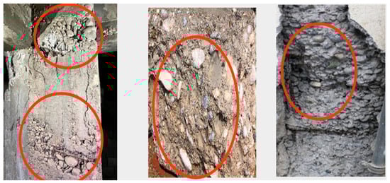 The strength of the concrete used in the reinforced concrete structures was determined by obtaining concrete core samples from the columns and walls located on the outer surfaces of these buildings, as specified in the code TS EN 12504–1 (2019) [48]. These concrete core samples were then tested in the laboratory environment according to the standards outlined in TS EN 12390–3 (2019) [49] in order to determine the strength of the concrete. The results for the concrete core samples indicated that the concrete classes in these buildings ranged from C6 to C12. However, many of the samples had such poor concrete strength that they could not be evaluated under the relevant standards. Further investigations revealed that almost all the earthquake-damaged structures had been constructed using extremely low-quality concrete that was manually poured on the worksite using traditional methods. Various negative factors were identified in this concrete, including the use of aggregates with inadequate granulometry, tuvanan aggregate, and an insufficient cement dosage, as well as an uneven concrete mixture (Figure 8). When examining the reinforced concrete columns of these buildings, it was observed that wooden waste materials and river aggregate with a diameter of 5–7 cm were present in the concrete. Aggregate size and segregation are shown in the figure circle. Additionally, it was discovered that the cement dosage used in the concrete was kept very low resulting in poor mixing and concrete fractures occurring at the cement–aggregate interface (Figure 8).