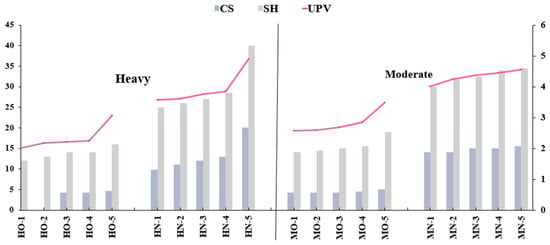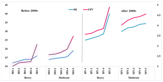 For the buildings produced post-2000, their UPV results were close to values that are considered good. Although the strength of their concrete was low, the age of the concrete and the use of ready-mixed concrete increased its quality. The lowest value obtained for these buildings was 3.57, while the highest was 4.9. Further, the UPV values of the moderately damaged structures were all close to one another. For the pre-2000 buildings, their concrete was of a low quality and porous, and its granulometry was not produced correctly. Although the pre-2000 buildings generally recorded a bad UPV value of 2, some structures recorded values close to or above 3, which were close to the average value. However, the Schmidt hammer strength values of the samples differed among the pre- and post-2000 buildings, as well as the UPV values. The granulometry of the aggregates used, segregation, and water–cement ratio all affects the strength of concrete. This study found that the concrete of the pre-2000 buildings performed poorly with regard to these factors. Values of around 14 were obtained for these pre-2000 buildings, while those for the post-2000 buildings varied between 25 and 40. Some of the values of the post-2000 buildings showed that their concrete was of a higher quality than that of the other buildings. In Figure 10, the UPV and Schmidt test values are compared to each other.