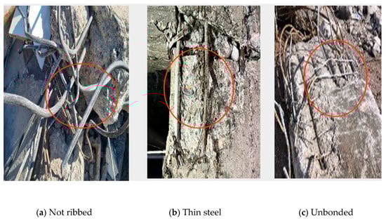 Given the widespread use of lower-strength flat bars (i.e., those with 220 MPa instead of 420 MPa yield strength) as transverse reinforcement in the structures analyzed, the brittle failure modes of their RC vertical load-bearing members and joints further reduced their spherical ductility capacity. As a result, their ductility capacity implied by the default response modulation factor, typically taken as 4–8, may not have been available (Figure 11a,b and in circle detailed). Further, this study found that mild steel reinforcement was used in most of the structures, while hooks were used for pressure reinforcement. However, the starter bars of the structures were not long enough at the lower ends of their columns. Reinforcement corrosion was also observed (Figure 11c and in circle detailed).