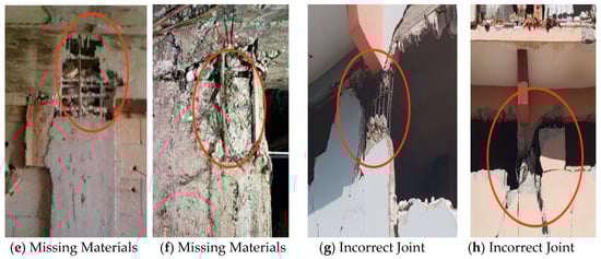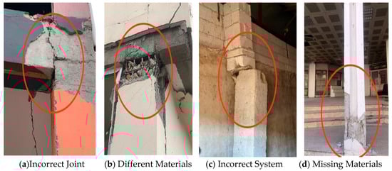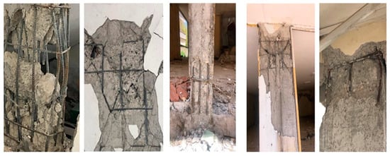In this study, serious damage was usually observed at the column–beam junctions of the buildings. Figure 16 shows a few typical cases to illustrate the main causes of failure or damage in these beam–column connections. A lack of transverse reinforcement was observed in most of the damaged columns analyzed; an example is shown in Figure 16d. In the examples shown in Figure 16b,c, inadequate stirrup spacing near the beam–column joints appeared to be the mechanism that caused severe damage where the stirrup spacing was greater. The column–beam connection details for the example shown in Figure 16e were not made available. In the example shown in Figure 16f, instead of concrete, large stones were filled into its columns. In the example in Figure 16g, its columns were not built at floor height, and its continuing columns were constructed using a material different to that used for the other columns (Figure 16g and drawn circles).
