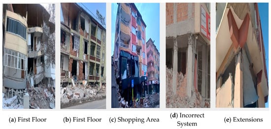 When the collapsed and heavily damaged buildings in the study region were examined, it was determined that these buildings’ columns received higher shear forces than the values envisaged in their design, due to their lower floors being used as shops, as well as their use of large heavy consoles (Figure 14a–e). Shear fractures occurred in the columns shown below in Figure 14. The effect of these forces caused the structures to collapse completely. Strong beam and weak column combinations are usually encountered in damaged or collapsed reinforced concrete buildings. In general, the ductility capacity of a structure decreases as its columns weakens relative to its beams. The post-yielding behavior of structures affected by this weak column–strong beam mechanism is marked by significant deterioration and strength degradation, as well as a small displacement capacity, indicating the fragility of these structures.