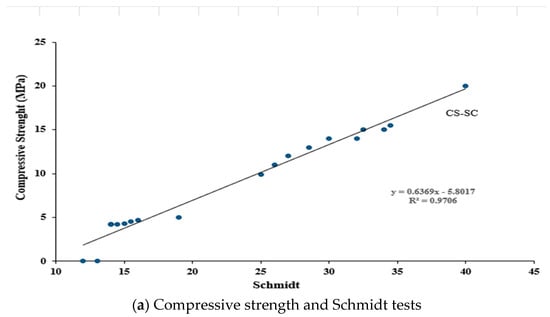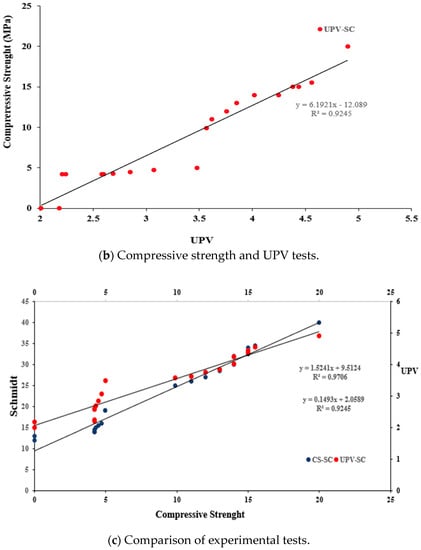Through these methods, this study found a linear relationship between the compressive strength of the obtained concrete samples and the pressure test data (Figure 17a–c).