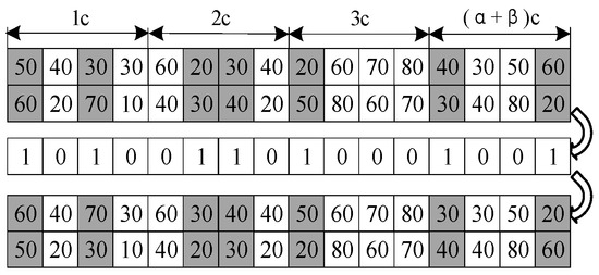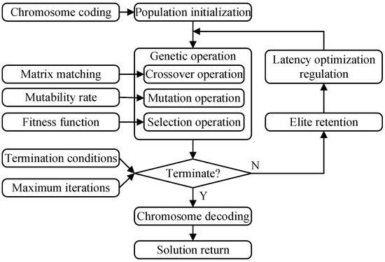 Step 3: Genetic manipulation and termination conditions. Due to the randomness of the roulette bet and crossover, individuals with higher fitness on the parental chromosome have a certain probability of being eliminated and optimized, resulting in a decline in the population’s average fitness. To solve this problem, the elite retention strategy is adopted in the chromosome selection process to preserve the top 10% of the parental population. That is, 10% of the population from the previous generation is directly copied to the next generation, and optimization individuals are retained to accelerate convergence. As shown in Figure 3, a uniform is selected as the crossover strategy. In other words, a 0–1 matrix matching chromosome length is randomly generated, and two chromosomes are selected for crossover according to gene position. If the corresponding position of the gene is 0, the status quo remains. If the gene’s position is 1, the points on the two chromosomes are swapped to form a new chromosome. As shown in Figure 4, the mutation strategy is to randomly select two genes on the chromosome for mutation while strictly controlling the mutability rate. Finally, if the number of iterations reaches or there is not much difference between the top two chromosomes, the algorithm terminates and outputs the optimal solution. When the algorithm encounters the latency optimization problem, it is generally due to the homogeneity of chromosomes produced by crossover operation or mutation operation. The simple solution is to preserve more 5% elite chromosomes of the previous generation. A further efficient approach is to generate a more suitable 0–1 matrix according to fitness function, but it may lead to higher complexity of the algorithm.