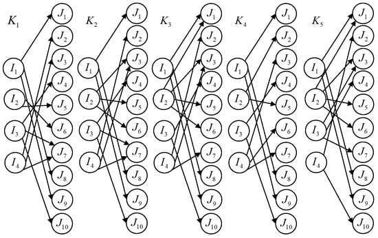 In the model, Formulas (4) and (5) are objective functions, and Formulas (6)–(14) are constraints. The objective function (4) minimizes the scheduling cost of mobile emergency vehicles, which is the sum of fixed costs, transportation costs, preparation costs, and penalty costs. The objective function (5) minimizes the scheduling time of mobile emergency vehicles, which includes transportation time, development time, and punishment time. Constraint (6) indicates that the sum of all kinds of demands in the mobile emergency system should not exceed the upper limit of the system reserve . It represents a ceiling on the availability of emergency supplies and services, regardless of how mobile emergency vehicles are deployed between mobile centers.