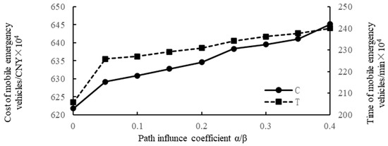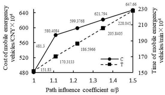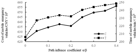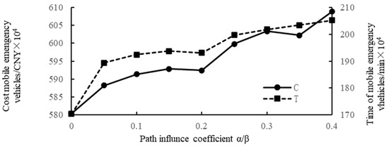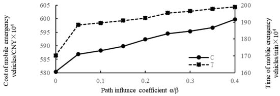 The specific transportation paths of all types of are shown in Figure 5. The path and demand uncertainty factors are controlled to verify the effectiveness of the mobile emergency vehicle scheduling model considering dual uncertainties. Suppose that the overall road condition deteriorates gradually; for example, the path complexity increases from 1.00–1.20 with step size 0.05, and the path integrity decreases from 1.00–0.80 with phase synchronization length. In other word, the path influence coefficient is separately set to , , , , and . The scheduling results are shown in Figure 6. The overall decrease in road condition inevitably leads to a synchronous increase in the scheduling cost and time of mobile emergency vehicles. However, under different road conditions, the values of emergency costs and emergency time are relatively balanced: the overall optimal is within a reasonable range, which shows that the model considers the fairness of cost and time allocation. It is worth noting that in the process of the path impact coefficient rising, compared with the determinacy model, the increased ratio of mobile emergency scheduling time is similar to the value of the path impact coefficient. However, the increased proportion of mobile emergency scheduling costs is relatively slow. This means that emergency decision-makers should pay more attention to the time lag of the scheduling scheme of mobile emergency vehicles when considering the negative impact brought by route factors and give more weight to the emergency scheduling time when the road condition worsens. As for the demand uncertainty factor, the maximum disturbance value is set to 50 and 100, respectively, and the example results are obtained when the control parameters are 0.1, 0.2, 0.3, 0.4, and 0.5, respectively. As shown in Table 5, the optimal solution values for mobile emergency scheduling cost and time increase with the increase in demand uncertainty. Under the premise of the same maximum disturbance value , the minimum distribution cost and the shortest distribution time have an increasing trend with the increase in the control coefficient . Moreover, when the control coefficient is equal, the larger disturbance value will inevitably increase the model results. This means that the emergency decision-making can choose the control coefficient according to the actual demand floating range when dealing with the uncertainty demand further to determine the emergency center configuration and vehicle scheduling scheme.