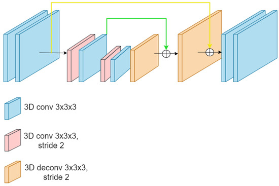 As shown in Table 1, F features that represent the number of additional dimensions are set to 8, 4, and 4 for stages 0, 1, and 2, respectively. In a cascaded 3D CNN, the additional dimension is kept the same, with a stride of one. Thus, to increase accuracy, the additional dimension needs to be increased, which leads to a large increase in the computational cost because the same resolution is maintained. An hourglass 3D CNN is based on an encoder–decoder architecture, which reduces the required amount of computation by compressing the spatial dimension of cost volume and learning more feature dimensions, then upsampling back to the original dimension of cost volume in the decoder. Specifically, we employ two sequential 3 × 3 × 3 convolutions with a stride of one followed by batch normalization and ReLU; the number of feature maps is F for the cost volume. Then, we compress the spatial dimension of volume by four times with two levels of the encoder. In each encoder level, two sequential 3 × 3 × 3 convolutions are applied, and the stride of the first layer is two. This results in the spatial dimension of the volume decreasing by a factor of two, whereas F is doubled. As a result, the size of the cost volume decreases by four times, and the number of feature maps is 4F. In addition, resolution loss decreases spatial accuracy and fine-grained details. To tackle this problem, we use two residual connections, as shown in Figure 3, to retain higher-frequency information. Then, we apply two 3D transposed convolutions with a stride of two; and the number of feature maps is 2F and F, respectively. Finally, 3 × 3 × 3 convolutions in series with a stride of one and a single-feature output in the last layer are applied to predict densities. This results in a final, regularized cost volume with a size of .