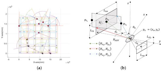 As shown in Figure 2b, a camera’s surveillance area in horizontal aspects lies within the two borderlines represented by and , respectively. Another line represented by goes through the surveillance area’s center, which divides the surveillance area in half and is also utilized to determine if the target belongs to the surveillance area. Equations (1) and (2) define these three lines: the function of variable x for the distance from the optic lens to the target, where is the FOV (Field of View) for variable x and is the viewing angle of the camera. Here, the FOV is a well-known factor defined as , and and are the width of the image sensor and the focal length, respectively. A further elaboration of Equations (1) and (2) from a geometrical perspective can be found within the confines of Appendix A of this paper.