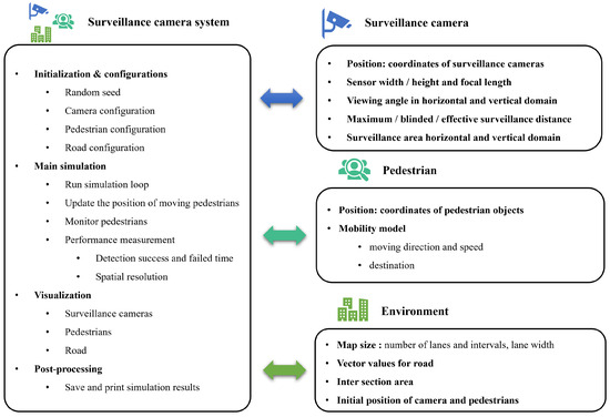 The fundamental approach taken to implement our system-level simulator involves defining classes that configure the surveillance camera, pedestrians, and the environment. Each class is responsible for generating a predetermined number of instances of surveillance cameras and pedestrians. These entities are then placed on an environment created through the employment of the environment class. This holistic approach enables conducting a comprehensive, system-level simulation of a surveillance camera system. Figure 3 illustrates the architecture of the developed simulation, demonstrating its core structure and components. The main simulation revolves around the utilization of classes that meticulously define the attributes and functionalities of key elements, namely surveillance cameras, pedestrians, and the environment.