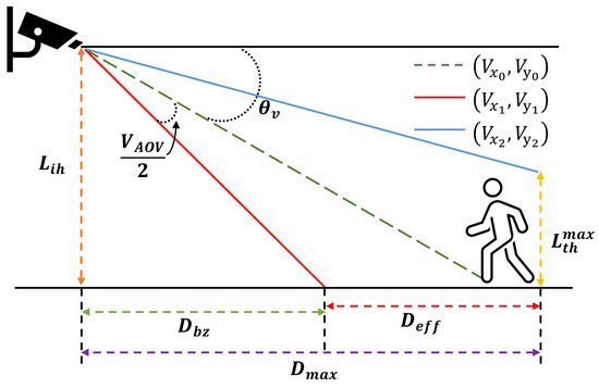 The next step is to determine the effective surveillance distance of the camera, as depicted in Figure 4. The effective surveillance distance of the camera is defined by (6), which is determined by taking into account the difference between the camera’s maximum surveillance distance, denoted by , and its distance to the blind zone, as represented by .