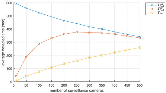 From this observation of and , it is clear that pedestrians can be detected more frequently as the number of surveillance cameras increases. However, even when the number of cameras is increased from 10 to 500, which is 50 times the initial number, pedestrians are still not detected for 340 s, which represents 56% of the total simulated time of 600 s. This suggests that merely equating the number of cameras to increase the surveillance coverage could be inefficient in terms of cost and performance improvement.