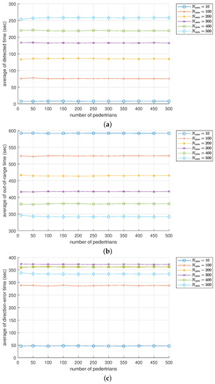 In this subsection, we present the simulation outcomes that illustrate the correlation between the number of pedestrians and the efficacy of the surveillance system, as indicated by the detection time , out-of-range time , and direction error time .