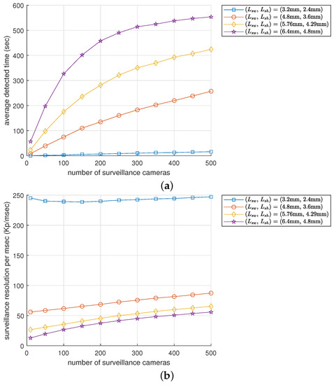 In conclusion, when contemplating the trade-off between detection time and surveillance resolution per ms, and given that only one sensor needs to be mounted on the surveillance camera, it may be feasible to mount a sensor with = (4.8 mm, 3.6 mm), for which both performance metrics are moderate. However, suppose multiple sensors with different specifications can be installed on a single surveillance camera. In this case, it might be more effective to select the appropriate sensor in accordance with the requirements of detection time and surveillance resolution per ms.