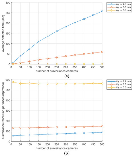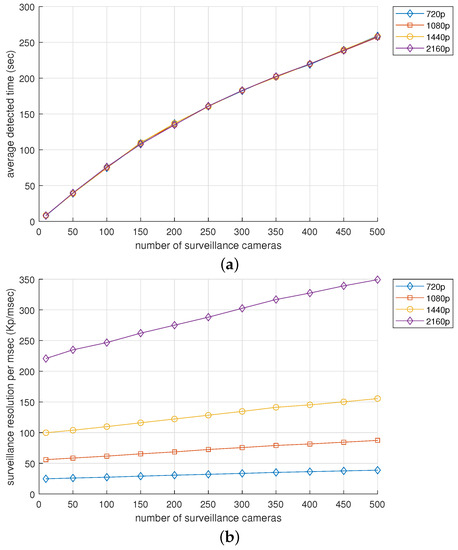 The results of this analysis are presented in Figure 9a, which illustrates the performance in terms of detection time . For instance, when the resolution is 720 p, the detection time increases from 8.0 s to 259.1 s as the number of surveillance cameras increases from 10 to 500. Similarly, for 1080 p resolution, as the number of surveillance cameras increases from 10 to 500, the detection time increases from 8.2 s to 257.1 s. At 1440 p resolution, the detection time increases from 8.4 s to 258.4 s, while at 2160 p resolution, the detection time increases from 8.1 s to 257.7 s. The detection time values are comparable regardless of the resolution in question, and the difference in the detection time among various resolutions only ranged from 0.1 to 1.3 s. That is, only the number of surveillance cameras was a dominant factor in this simulation study. This is because the resolution is not a mandatory configuration for the surveillance area.