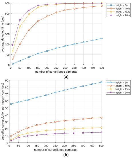 In this subsection, we will analyze the impact of surveillance camera installation height on the overall performance of the surveillance camera system. The simulation evaluated four different installation heights, which are 5 m, 10 m, 15 m, and 20 m. Figure 10a showcases the surveillance camera system’s performance, , as a function of the installation height. It is evident from Figure 10a that the higher the installation height of surveillance cameras, the longer the detection time. For instance, if the number of cameras is increased from 10 to 500, at the height of 5 m increases from 8.2 s to 257.1 s. Similarly, at 10 m, increases from 58.3 s to 574.2 s; at 15 m, increases from 133.2 s to 598.6 s. Finally, at 20 m, increases from 191.3 s to 599.2 s.