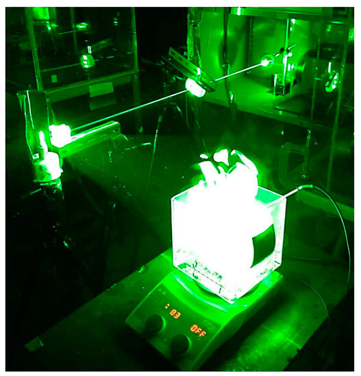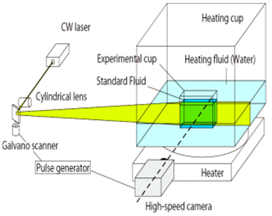 To gain insight into the physical phenomena in the test cup, the velocity field is measured using Particle Image Velocimetry (PIV). The experimental setup for flow visualization is shown in Figure 5. To visualize the flow in the test fluid, a small amount of nylon tracer particles with a diameter of 20 μm and a specific gravity of 1.02 are introduced. Planar measurement of the velocity field is performed using a PIV system consisting of a CW Nd:YAG laser of 8 W power and a high-speed CMOS camera (1280 × 1024 pixels with 8-bit) operated by a pulse controller. The CMOS camera is positioned at a distance of 550 mm from the test cup. The frame rate of the camera is set to 130 frames per second with an exposure time of 7.6 ms. It is important to note that the camera lens has a focal length of 75 mm and an f-number of 2.8, while the thickness of the light sheet used for visualization is approximately 1 mm [23,24].