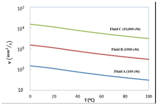 The test fluids used in the experiments are silicone oils purchased from Shinetsu Chemical Co. located in Yokohama, Japan. Their viscosity–temperature characteristics are presented in Figure 3. These fluids are denoted as Fluid A (KF-96-100 cSt), Fluid B (KF-96-1000 cSt), and Fluid C (KF-96H-10000 cSt), and have different kinematic viscosities of 100, 1000, and 10,000 mm²/s, respectively, at 25 °C. It is noteworthy that all three liquids have the same specific heat of 1.5 J/g·°C and a thermal conductivity of 0.16 W/m·°C despite their different viscosities.