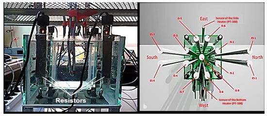 As shown in Figure 4, a total of nine precise and calibrated thermocouples (accurate to ±0.02 °C) are strategically placed at various locations in the experimental beaker. The experimental cup is then placed in the center of a second cup, which serves as the heating cup. Water is used as the heating fluid, and six thermocouples are also placed in this heating beaker to ensure a uniform temperature of the heating fluid. To achieve controlled heating, the temperature of the heating fluid is gradually increased at a constant rate of 5 °C per minute, which is controlled by a 2500-watt resistor at the bottom and four 200-watt resistors (one at each corner) of the heating cup, as shown in Figure 4. It is expected that the use of five resistors can produce more homogeneous temperature fields, minimizing viscosity measurement errors. Throughout the experiments, the temperature values of all thermocouples are recorded simultaneously to analyze the temperature distribution in the fluid.