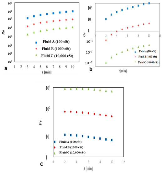 Time variation in (a) Rayleigh number, (b) Grashof number, and (c) Prandtl number in measurements.