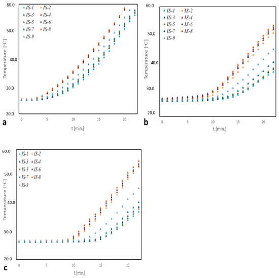 Temperature assessment of (a) Fluid A (100 cSt); (b) Fluid B (1000 cSt); and (c) Fluid C (10,000 cSt).
