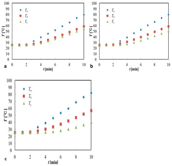 Similar outcomes are presented from the flow visualization experiment. Figure 10 illustrates the temporal evolution of temperatures for the test fluids in the test cup, as well as the heating water, as recorded by the thermocouples. All temperatures gradually rise as time (t) progresses following the initiation of heating. Notably, the temperatures of the test fluid and the heating water are initially maintained at the same level during the onset of heating. While the relationship between temperature and time in the heating water remains unaffected by fluid viscosities, the temperatures (Tc and Tb) within the cup are influenced by the viscosity of the fluid. This effect becomes more pronounced for fluids with higher viscosities, leading to an increased temperature difference.