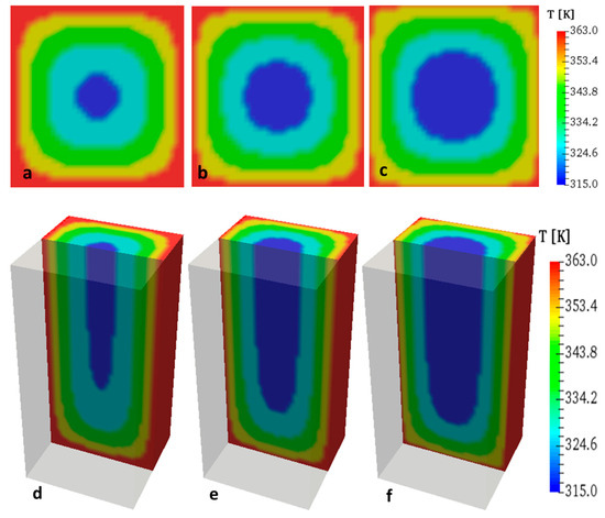 Thermal conduction when t = 10 min in top view: (a) Fluid A (100 cSt), (b) Fluid B (1000 cSt), (c) Fluid C (10,000 cSt) and projectile view, (d) Fluid A (100 cSt), (e) Fluid B (1000 cSt), (f) Fluid C (10,000 cSt).