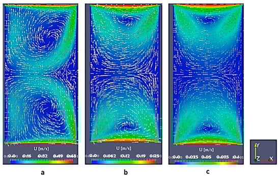 Figure 14 and Figure 15 show the velocity fields in the test cup for Fluids B and C, respectively, 8 min after the initiation of the heating. These results indicate that the magnitude of the thermal convection decreases as the viscosity of the fluid increases, corresponding to a decrease in the Rayleigh and Grashof numbers and an increase in the Prandtl number. Therefore, the influence of thermal convection becomes weaker for the highly viscous fluids and thermal conduction becomes the main method for the heat transfer. This result agrees well with the experimental observation of the temperature variations in the test cup and the estimates of the Rayleigh, Grashof and Prandtl numbers in Figure 6.