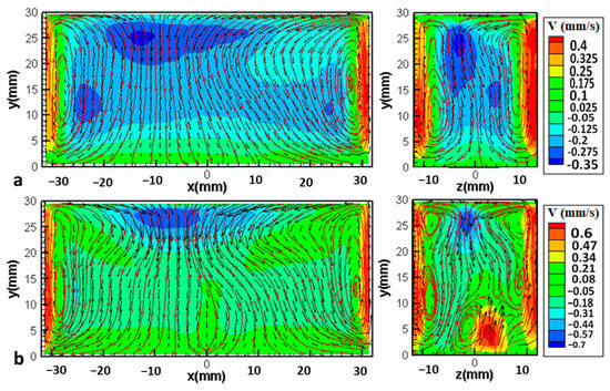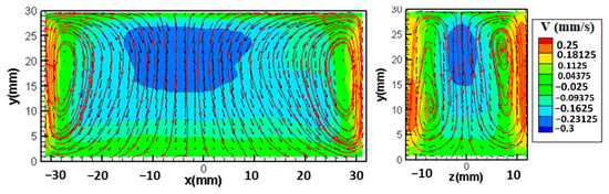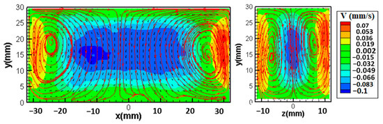 Figure 13 displays velocity field measurements within planar sections observed from the front and side of the test cup. These sections are taken through the center of Fluid A at the eight-minute mark, as captured during the current PIV experiment. The figure presents velocity vectors, magnitudes, and streamlines, providing insights into the flow dynamics within the test cup. Notably, the velocity magnitude (v) is depicted using color-coded bars. Importantly, it should be noted that the cell pattern exhibits asymmetry concerning the midplane. This asymmetry arises due to the considerable Rayleigh number of 6.6 × 105, which induces flow instability [28].