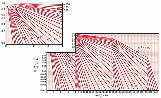 - Janna, W.S. Chapter 4—Unsteady state heat conduction. In Engineering Heat Transfer, 2nd ed.; CRC Press: Boca Raton, FL, USA, 1999; pp. 195–196. [Google Scholar]