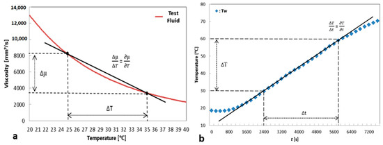 (a) Viscosity change through temperature for a test fluid; (b) wall temperature change in time of a test fluid in low heating speed (0.5 °C/min). Black line emphasizes the difference among selected points.