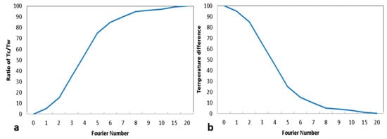 (a) Ratio of Tc/Tw in percentage as the Fourier number increases. (b) Temperature difference as the Fourier number increases.