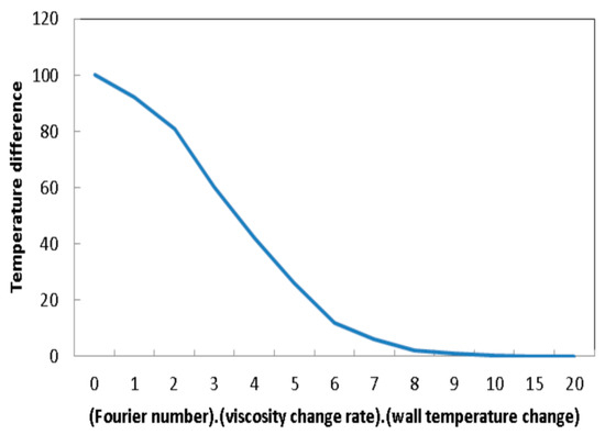 Temperature difference and its relationship with Fourier number, viscosity change rate in temperature (), and the wall temperature change () in time.