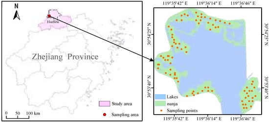 The Xianshan Lake Wetland Park is located in Changxing County, Huzhou City, Zhejiang Province, China. It is situated in the northern part of Zhejiang Province and at the intersection of Zhejiang, Jiangsu, and Anhui provinces. The park covers an area of 2692.2 hectares. It is not only one of the largest wetlands in the province of Zhejiang’s north, but it is also one of the most ecologically diverse and unspoiled wetland ecosystems in the Yangtze River Delta, as well as a typical example of the natural wetlands and artificial lakes and wetland systems in Zhejiang. Its geographic structure is shown in Figure 1. The sample region has a diverse range of flora and animals, a thick canopy of vegetation, a subtropical monsoon climate, four distinct seasons, and a variety of landforms. It also has a moderate climate, plenty of sunshine, and abundant rainfall. The average annual temperature is 15.2 degrees Celsius, the average annual sunshine hours are 2074 h, and its soil types are mainly bog soil, paddy soil, and red earth soil.