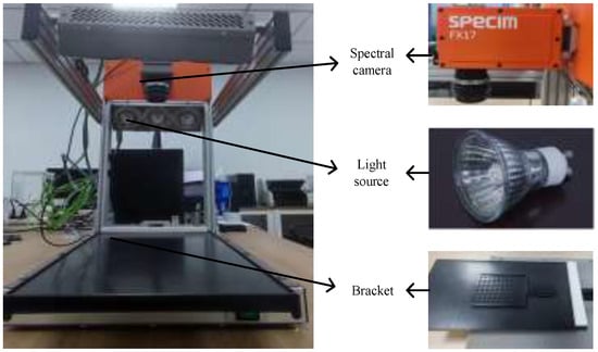 Soil spectral reflectance was determined using an FX(17) hyperspectral camera with a spectral range of 900–1700 nm and a spectral resolution of 3.5 nm, containing a total of 224 bands. The spectral equipment acquisition device is shown in Figure 2. During the determination process, the light source was provided by six 50 W halogen lamps. The fiber optic probe had a field of view of 10°, and it was positioned at a distance of 20 cm from the surface of the soil samples. Each soil sample was divided into 27 portions and placed in a tray. Before the determination, each sample was calibrated with a white board to reduce instrument-related errors. Subsequently, based on ENVI5.3 software, 27 spectral curves were measured for each soil sample, and the average value was taken as the actual spectral curve for that soil sample after removing the outliers [15].