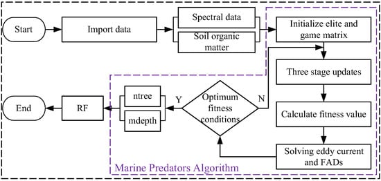 While the traditional machine learning models mentioned above have shown certain advantages in determining the SOM content, they often require significant computational resources to search for optimal parameters and often fail to find the best hyperparameters. Therefore, we propose Marine-Predators-Algorithm-Based Random Forest (MPARF) to enhance the performance and training speed of the RF model while reducing model overfitting. Specifically, due to the significant impact of the number of trees (ntree) and the maximum depth of trees (mdepth) on the accuracy of RF model, this study utilizes the MPA to optimize the parameters ntree and mdepth. The MPARF model is constructed to enhance the performance of RF in SOM content detection.