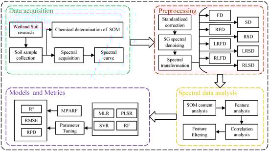 As a critical source of nutrients and a fundamental element of a soil’s energy, the soil organic matter (SOM) content describes the organic material that is present in soils. Changes in the SOM content, which is a key determinant of soil fertility, have a direct impact on the quantity of water and other microorganisms in the soil. These changes also have a significant effect on the biological, chemical, and physical characteristics of the soil [1]. Therefore, the rapid and accurate acquisition of the SOM content has become an inevitable need for modern agriculture development, which plays a vital role in maintaining ecological balance and promoting sustainable agricultural development. In the past few decades, methods for evaluating the SOM content have been thoroughly studied by researchers, and these methods may primarily be divided into two categories, i.e., conventional chemical technology and hyperspectral technology [2]. Due to their greater precision, stability, and dependability, traditional chemistry technologies are frequently used to determine the SOM content. But there are a lot of drawbacks, including cumbersome operation, environmental pollution, time-consuming and labor-intensive processes, and the need for experienced measurement personnel. Compared to conventional chemical technology, hyperspectral technology offers a number of benefits while retaining excellent accuracy, such as being easier to use, using fewer resources, performing analyses more quickly, and not polluting the environment. Specifically, hyperspectral techniques utilize soil spectral reflectance to capture the optical properties of soils at different wavelengths. By measuring and evaluating the spectral reflectance of soils, the physical and chemical qualities and properties of soils can be determined.